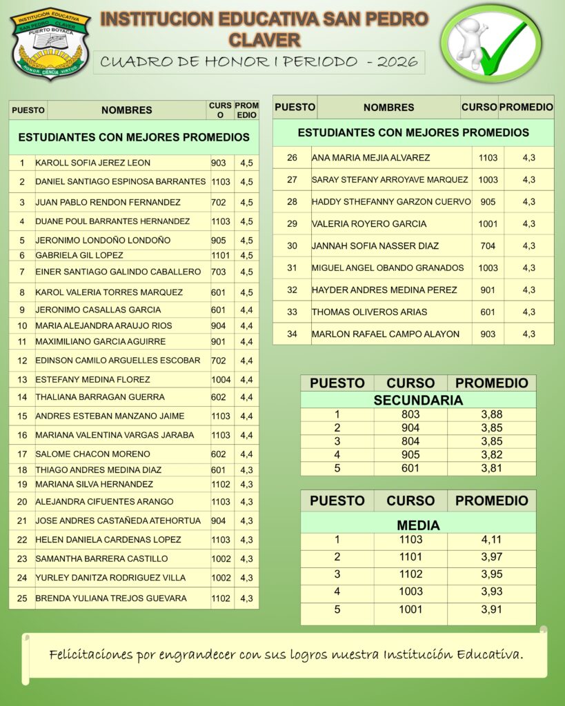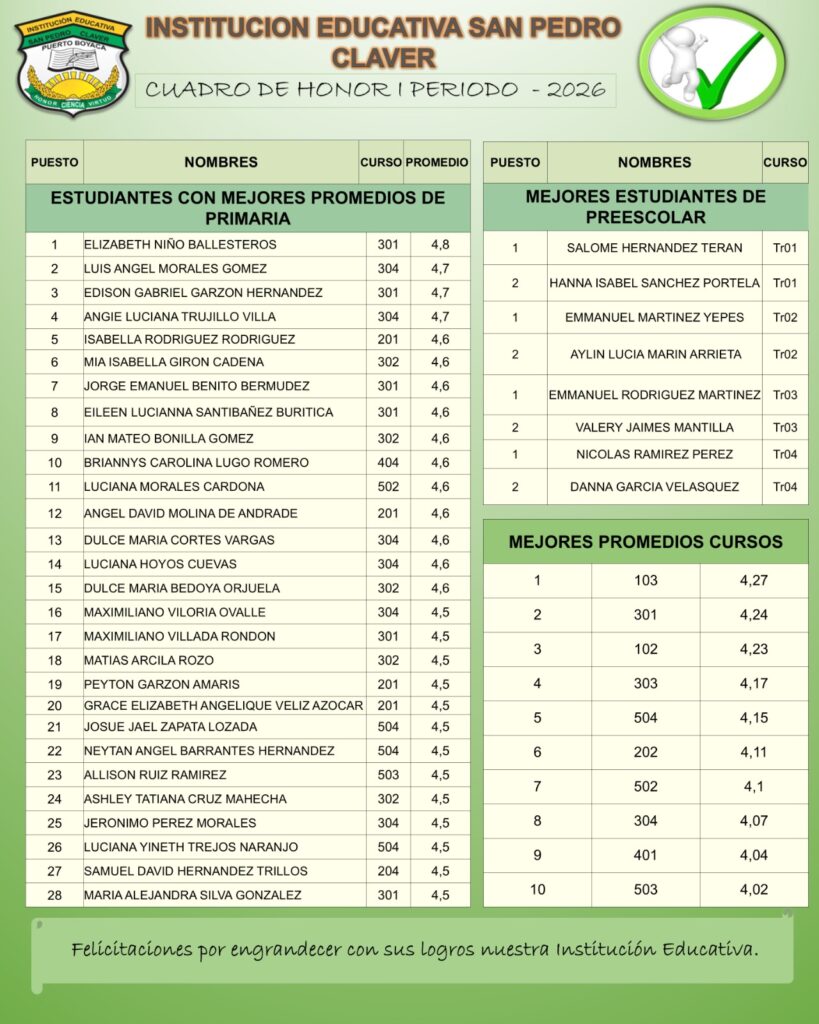 CUADRO DE HONOR I PERIODO