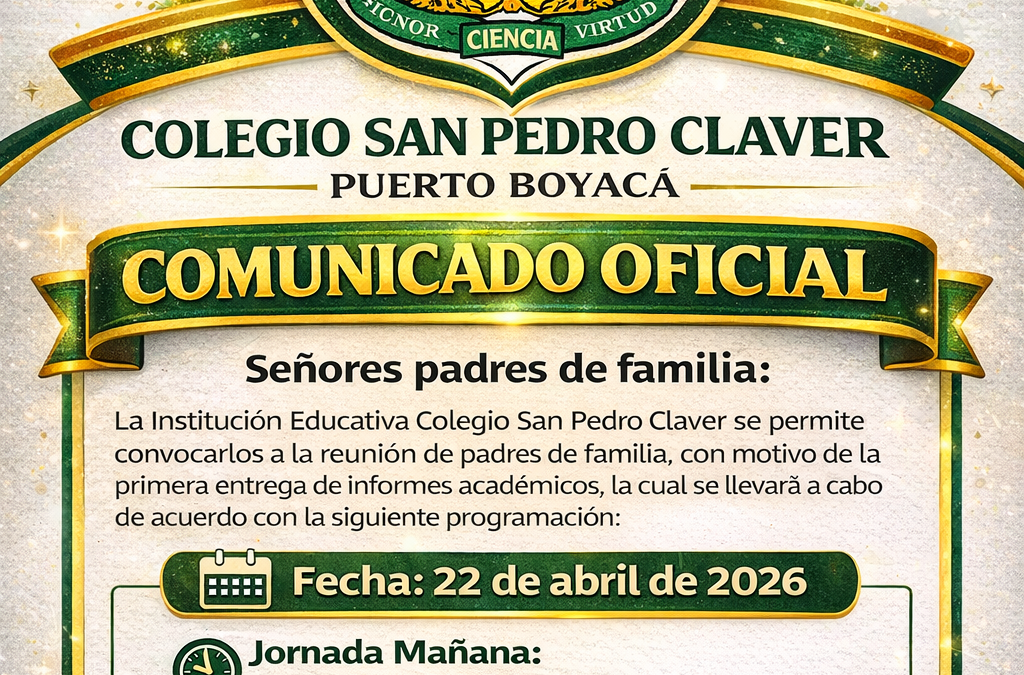 La Institución Educativa Colegio San Pedro Claver se permite convocarlos a la reunión de padres de familia, con motivo de la primera entrega de informes académicos, la cual se llevará a cabo de acuerdo con la siguiente programación: